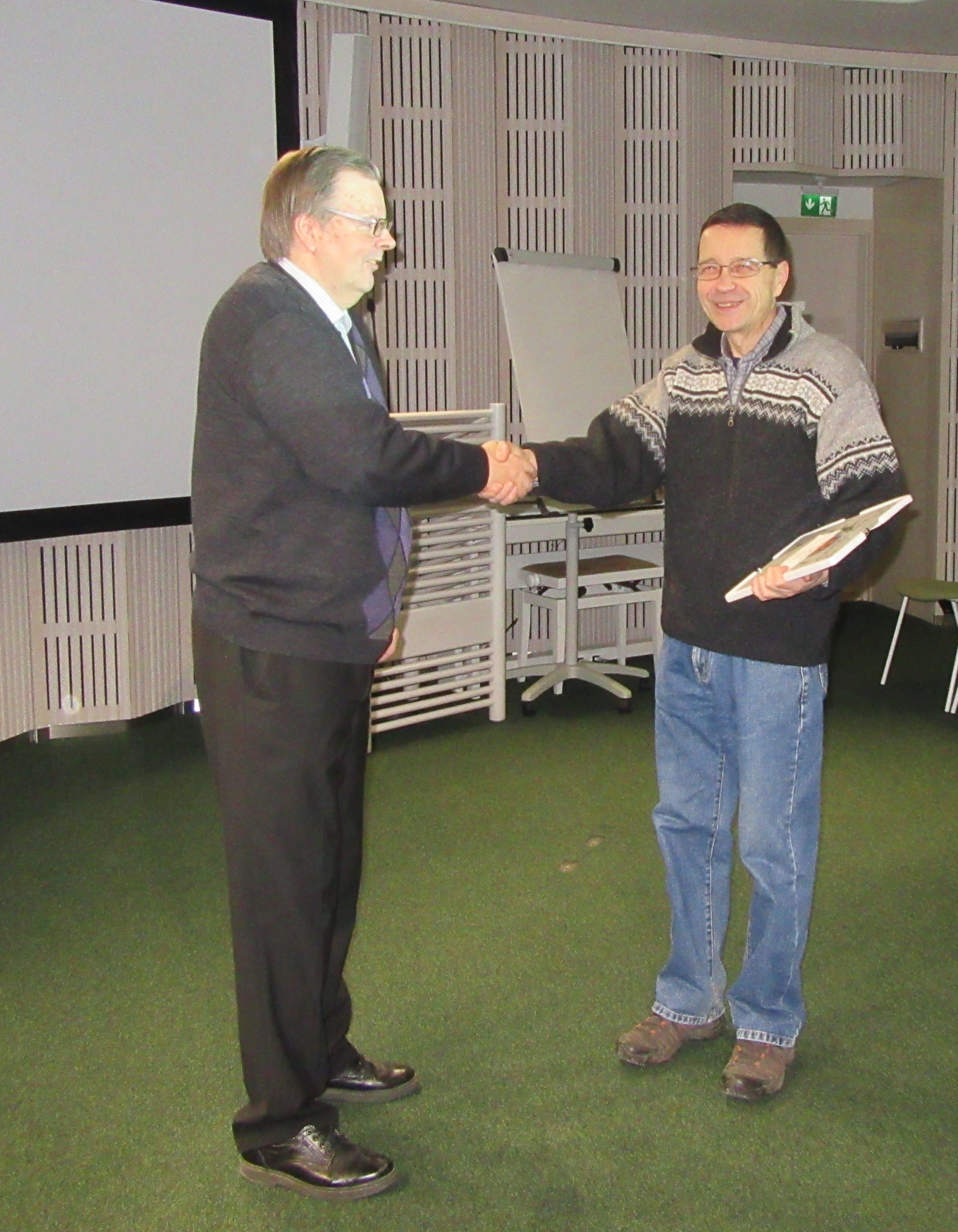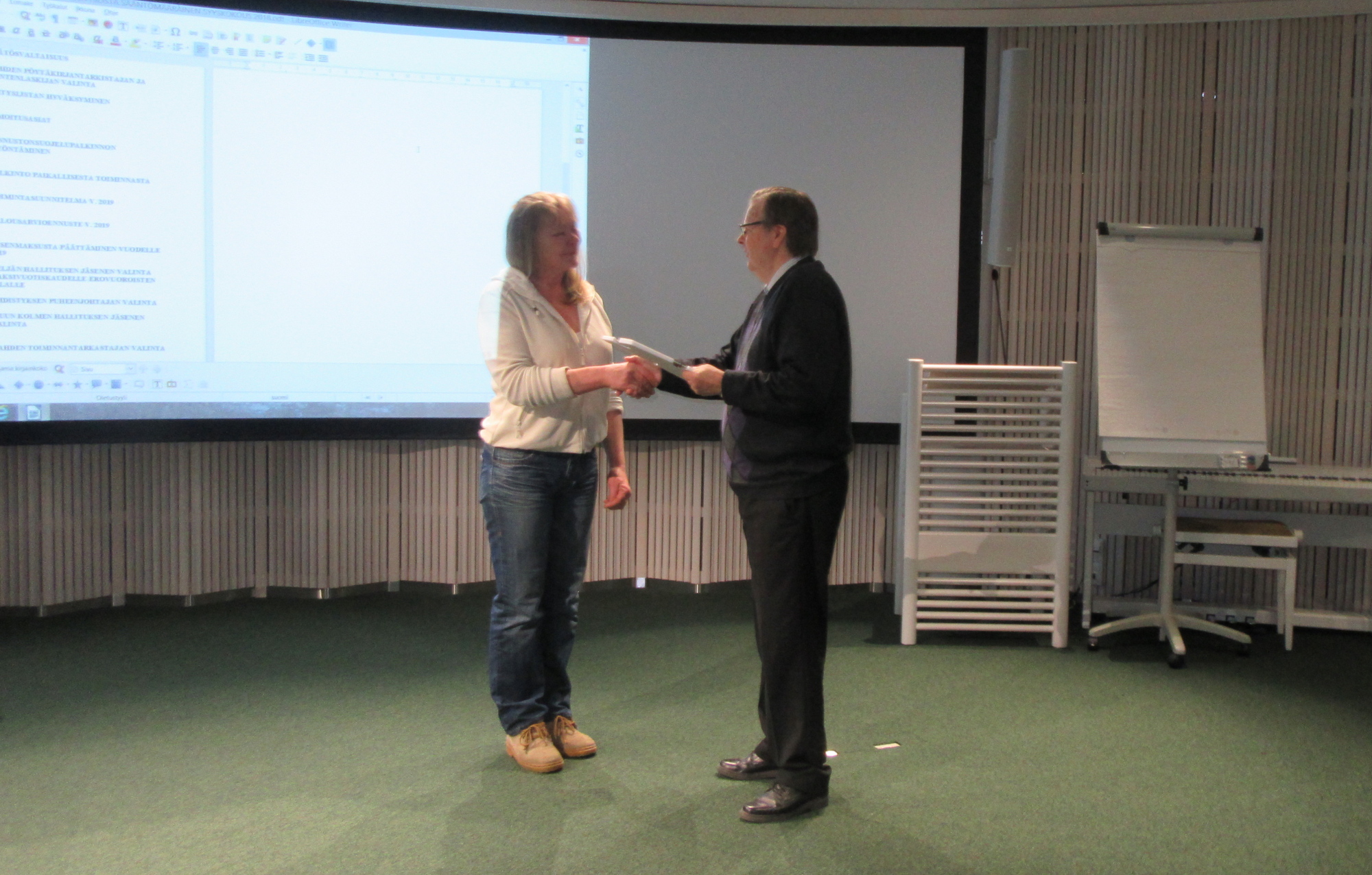 Tuija Palosen ottamissa kuvissa saa Marija Wallden Sastamalasta linnustonsuojelupalkinnon ja Olavi Autio Tampereelta palkinnon kunniamainintoineen Iidesjärveä koskevan nettisivuston ylläpidosta. Onnittelijana Pilyn puheenjohtaja Jukka T. Helin.