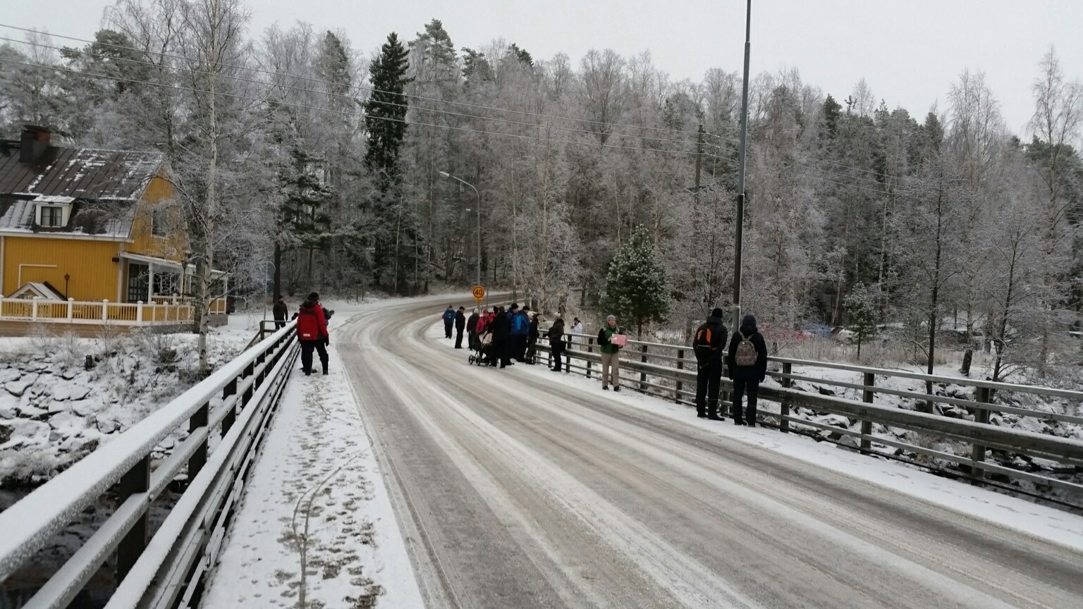 Huurteisen harmaa sää ei haitannut, sillä Siuronkosken sillan kupeeseen, Koski-Baarin nurkalle, kerääntyi 42 koskikaroista innostunutta henkilöä oppaat mukaan lukien. Nuorimmainen osallistuja uinui vaunuissa ja kaksi isompaa lasta oli mukana retkellä.