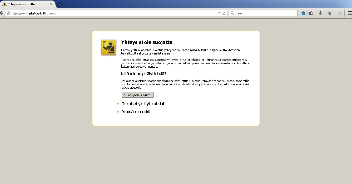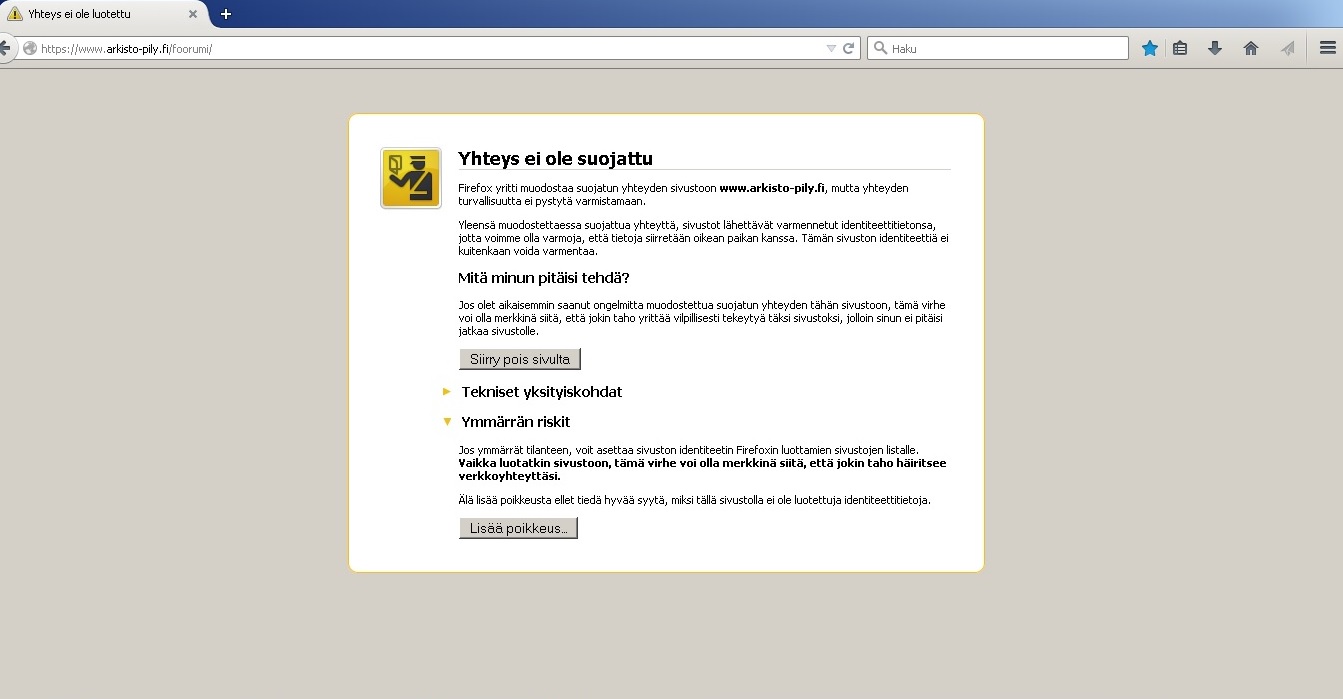 foorumi ei käytä omaa SSL-sertifikaattia ( vaan palveluntarjoajan yhteistä sertifikaattia ), joten jos käyttää osoitetta https://.. selain kyselee turvallisuuspoikkeamasta ja pyytää hyväksymään yhteisen sertifikaatin. Käyttämällä pelkkää http://www.arkisto-pily.fi/foorumi -osoitetta ei noita turvallisuuspoikkeama kyselyjä tule.